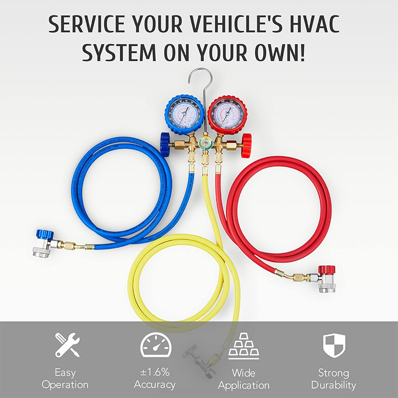AC Gauges, AC Manifold Gauge Set for R134a R12 R22 R502, 3 Way Automotive AC Gauge Set with Antishock Gauges Hoses Couplers Adapter, Puncturing Can Tap Freon Recharge Kit