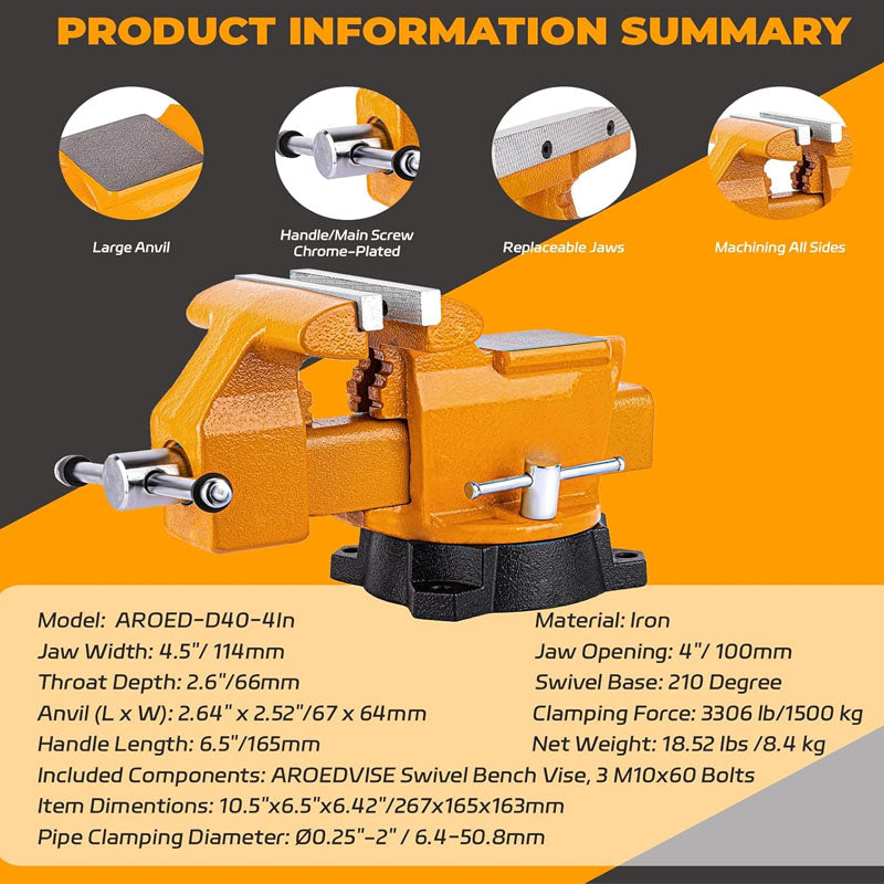 Multi-Jaw Function: AROEDVISE heavy duty bench vise is specifically designed to clamp flat materials, pipes, and tubes efficiently. The anti-slip design of jaws ensures the protection of clamped items from scratches and damage.The 2.6x2.5" anvil operating area provides an ideal workspace for hammering, sawing, drilling and gluing
