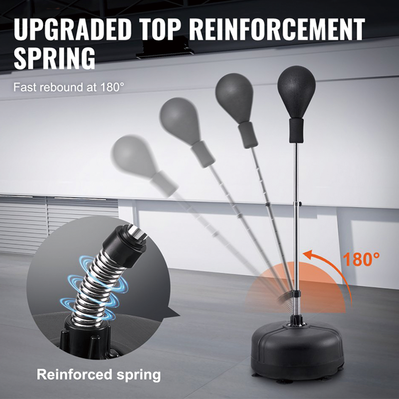 SPRINGS BACK IN PLACE WITH EASE: Designed for optimal and safe use, our free standing boxing bag features a strong, durable spring at the base of the shaft. This allows the spring mounted punching bag to bounce back into position every time after every hit.
