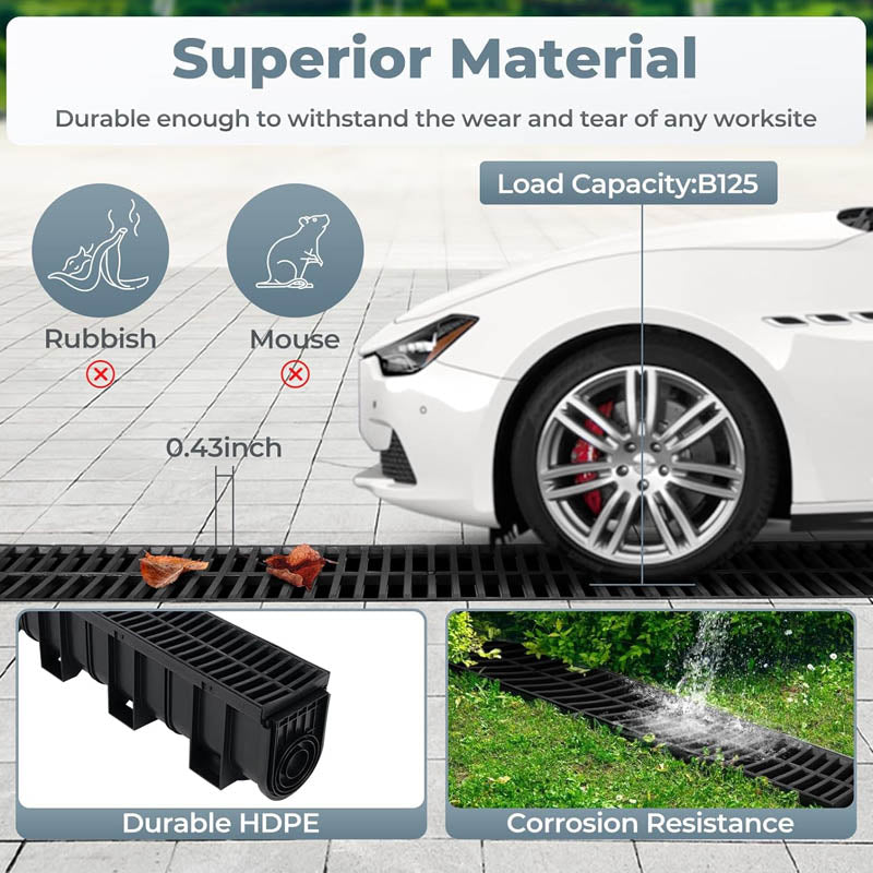 5 Pack Channel Drain with Plastic Grate 5.9x7.5-Inch Drainage Trench with 5 End Caps  for Garden, Driveway