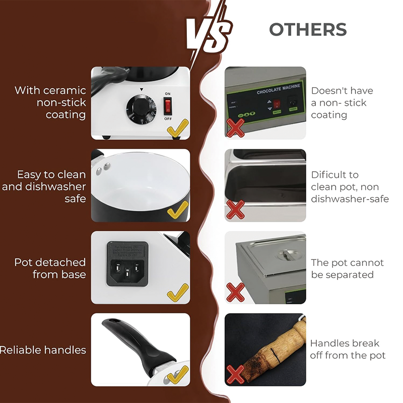 Made from high-quality food-grade aluminum for fast heat conduction, rust resistance, and easy cleaning. PTC energy-saving technology ensures quick and efficient chocolate melting, reducing wait time without burning or sticking.