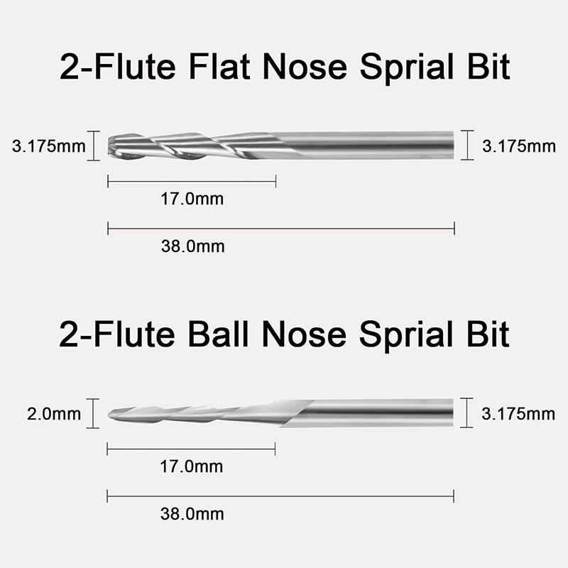 Shank Diameter: 3.175mm(1/8inch), Cutting Diameter: 3.175mm, Cutting Length: 17mm, Overall Length: 38mm.(Note: The Ball Nose End Mills's cutting diameter is 2mm)