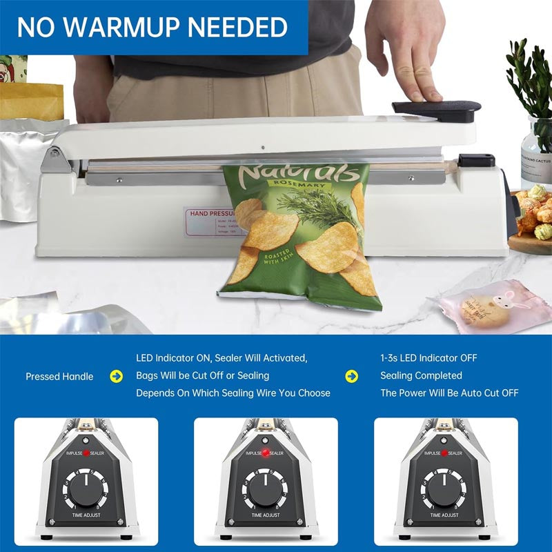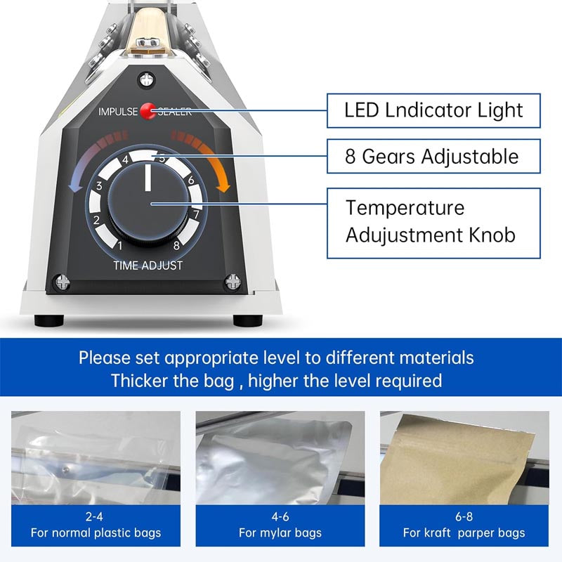 [Instantly use and optimal results]: With no warm-up time needed, our R-PACK Impulse Heat Sealer is ready to use right away. Simply keep the handle pressed down for 3-5 seconds to achieve perfect seals every time. The lightweight design and 8 stalls temperature adjustment feature allow for easy operation and compatibility with different materials bags.