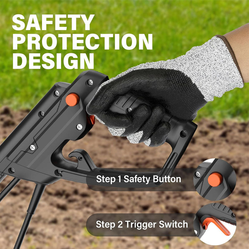 [DOUBLE SAFETY PROTECTION] In order to ensure the safety of users, we have designed a double start button on this tiller, only when the safety button and trigger are pressed at the same time, the machine will start, preventing accidental injuries caused by accidental start, and also configured with overload protection.