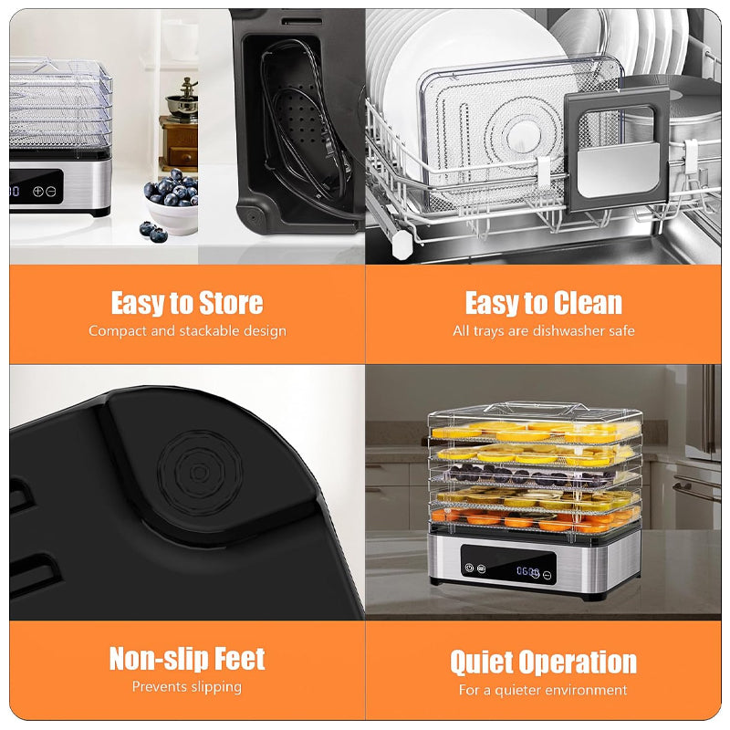 Non-slip feet ensure stability, while the quiet operation lets you dehydrate foods without disturbing your environment.