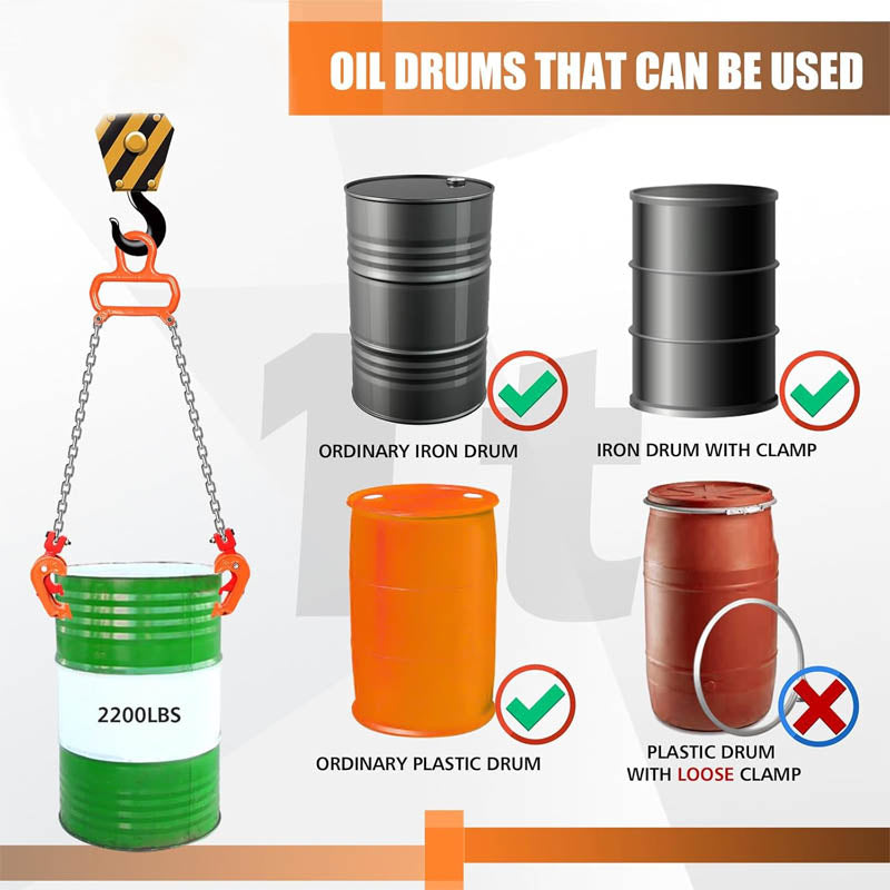 【SPECIFICATION】Capacity up to 2200 lbs/1Ton vertical drum sling is designed to lift 30-gallon and 55-gallon drums.The Frame is Made of alloy steel with strong hardness,anti-impact and anti-oxidation,Galvanized anti-corrosion chain and for long service time.
