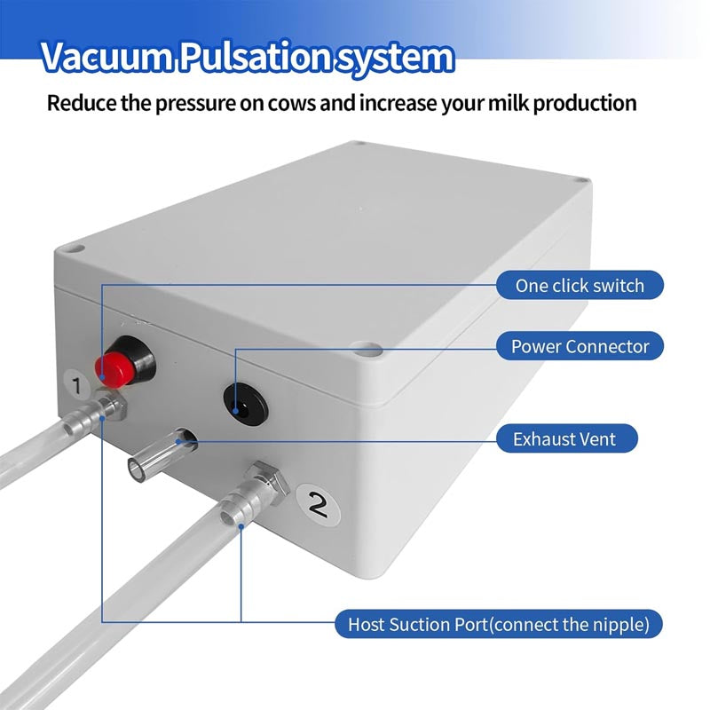 Enhanced pulsation system: The pulsation system simulates artificial milking technology,which will not harm cows during the milking process,providing comfortable massage for cows and increasing your milk production.