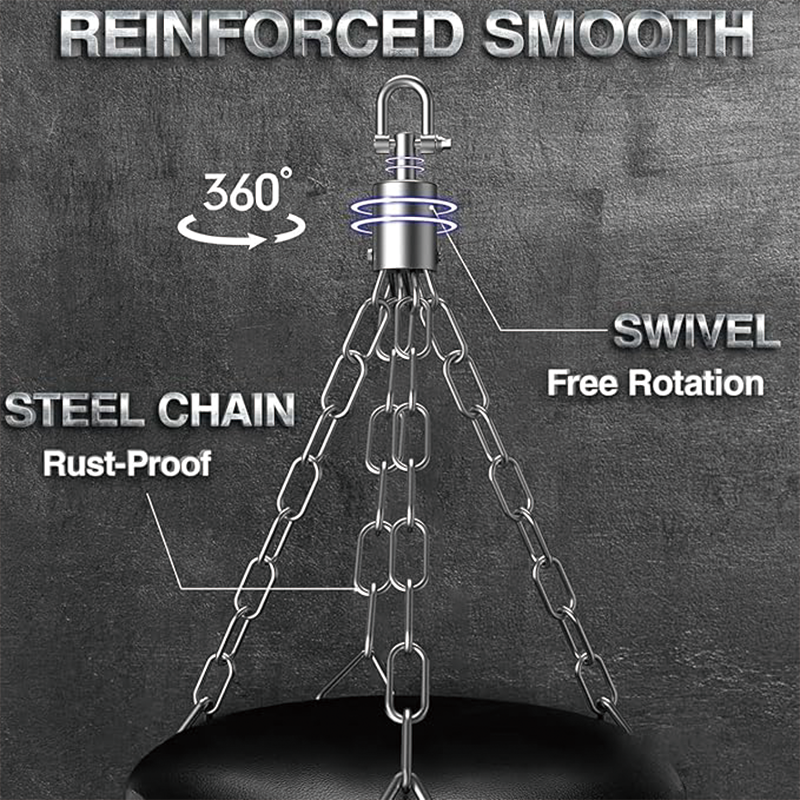 360° Swivel and Sturdy Hanger:Unique 360° Swivel keeps the bag rebound freely after being hit. Equipped with reinforced bag hanger, 4 expansion bolts and a carabiner, it can hold up to 1100LB! Screw up the hanger and start your boxing training!