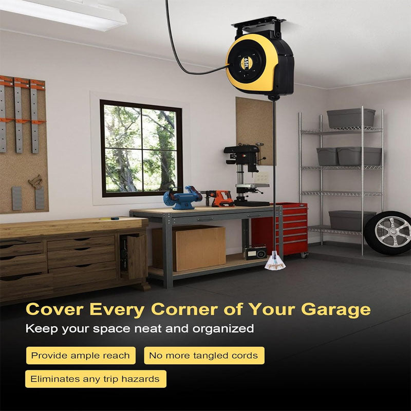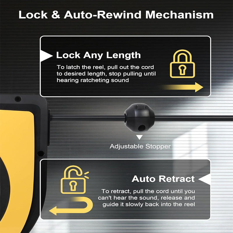 65 FT Extension Cord Reel Duty 12AWG/3C SJTOW Power Cord  with Lighted Triple Outlets 15A Circuit Breaker  180° Swivel Removable Bracket