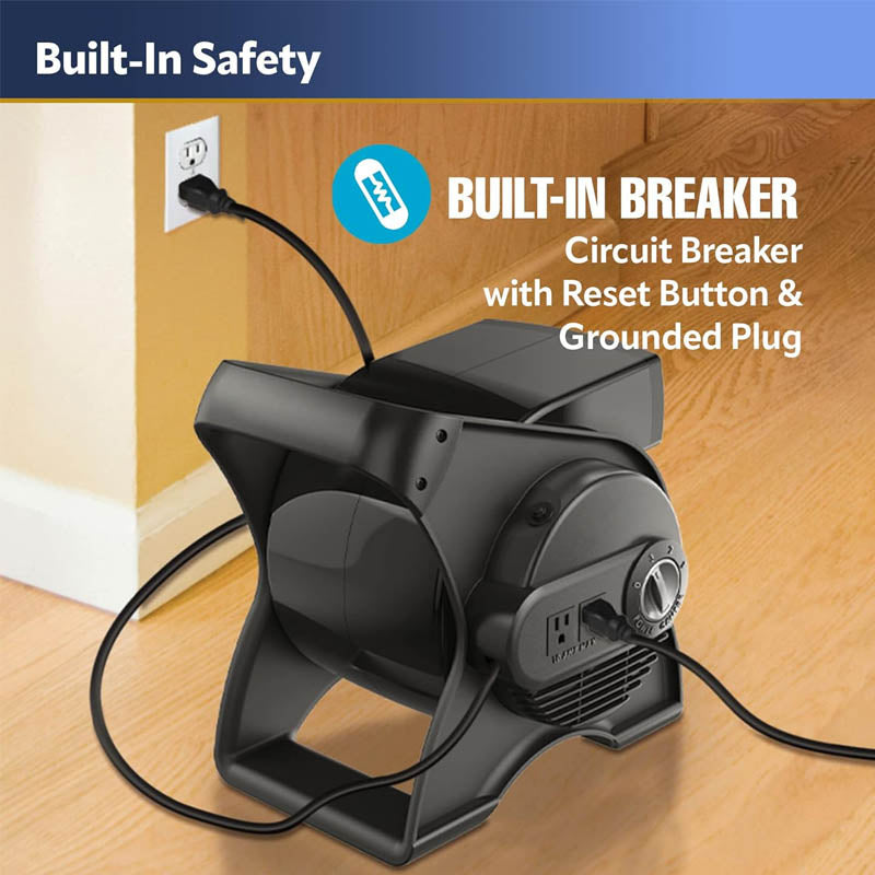 【CONVENIENT FFEATURES】This powerful utility blower fan features two 120-volt grounded outlets for accessory use; the patented 270-degree pivoting action allows you to direct the airflow right where you need it.
