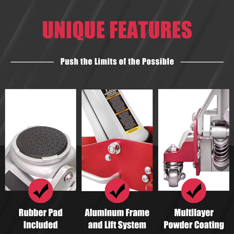 1.Racing floor jack can be used for general or specialty use and features a 1.5 ton (3,000 lbs) capacity.
