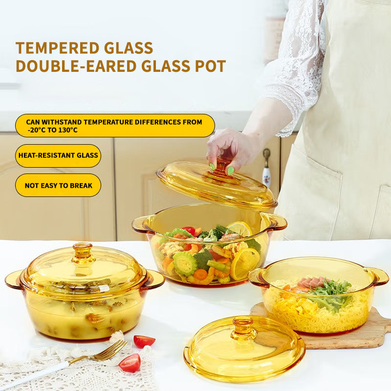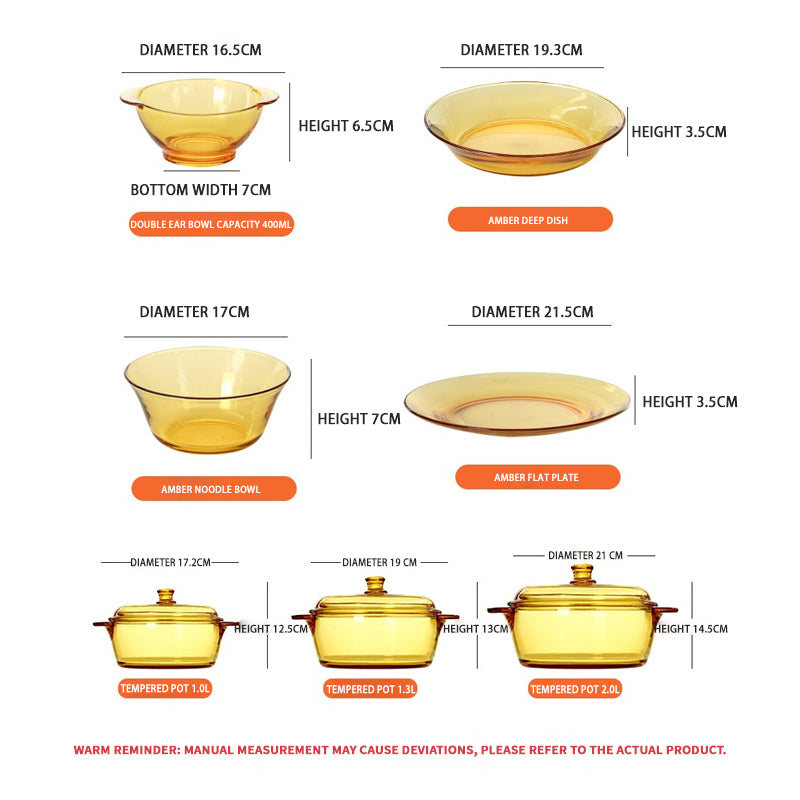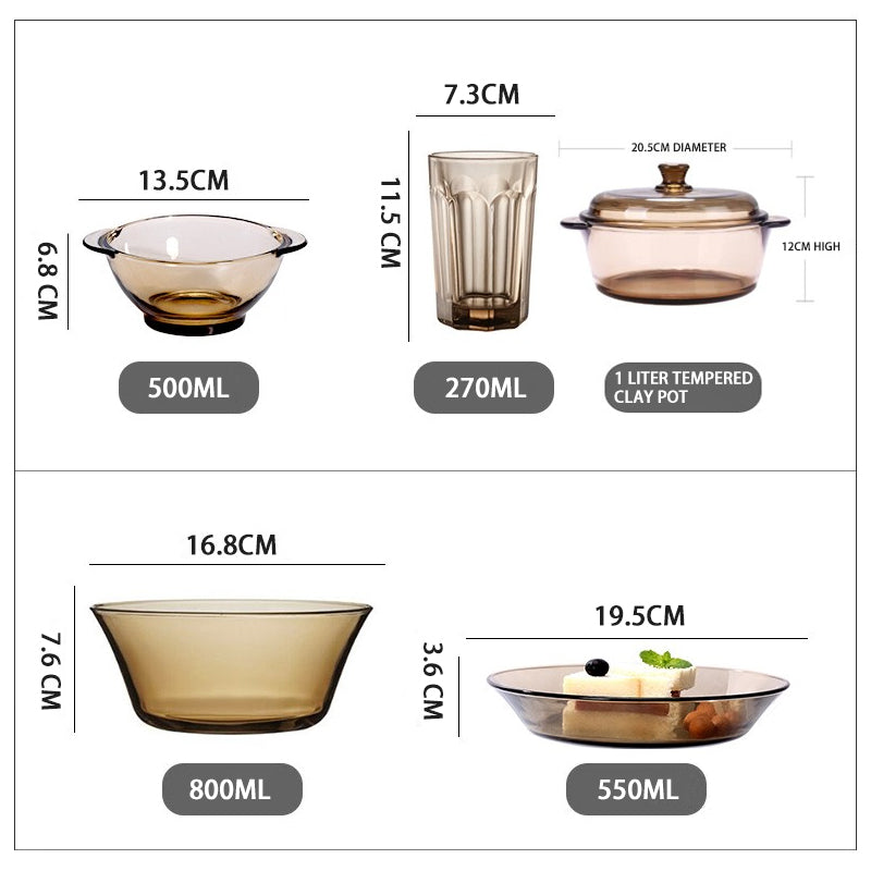 Amber tableware 11-piece set(Deep plate*2+shallow plate*2+double-eared bowl*4+deep bowl*2+1L glass pot*1)