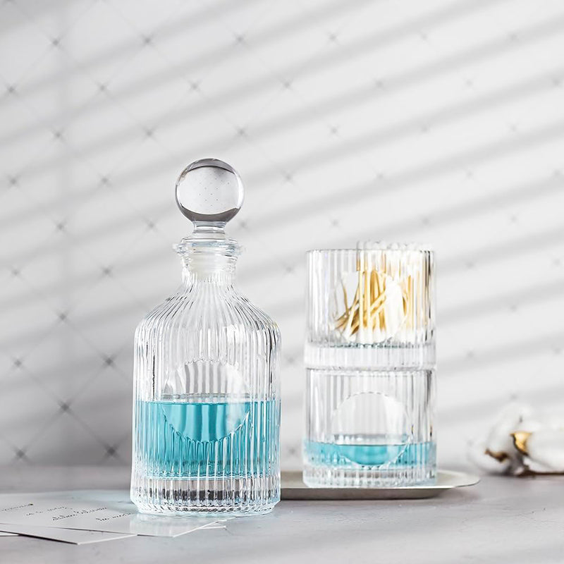 Design: Whiskey decanter set(include one decanter with 2 Drinking glass) which is silicone stopper, Ribbed Striped Design and drink glass can be overlap together.