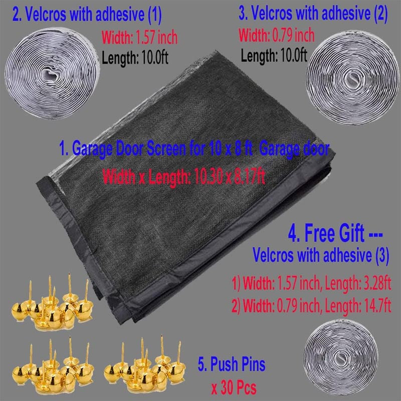 [EASY AND FAST TO INSTALL] - Installs in few minutes with the included hook&loop strips to finish installation very easy, instant. Extra push pins for added security and strength. The screen mesh of this 10.30x8.17ft garage door screen is retractable, detachable, can be tightly twisted and folded with the included 9 storage belts to temporarily store off-season.