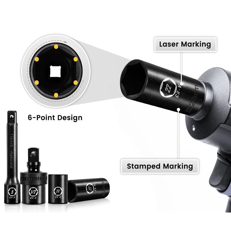 【SUPERIOR CR-V STEEL】 Constructed with heat-treated forged chrome vanadium steel, our 1/2" impact socket set has high hardness and durability, and can withstand greater torque from impact tools. The sturdy and professional chrome vanadium alloy structure allows you to undertake different projects.
