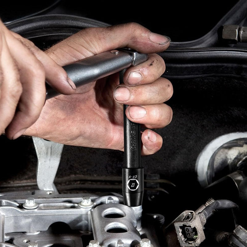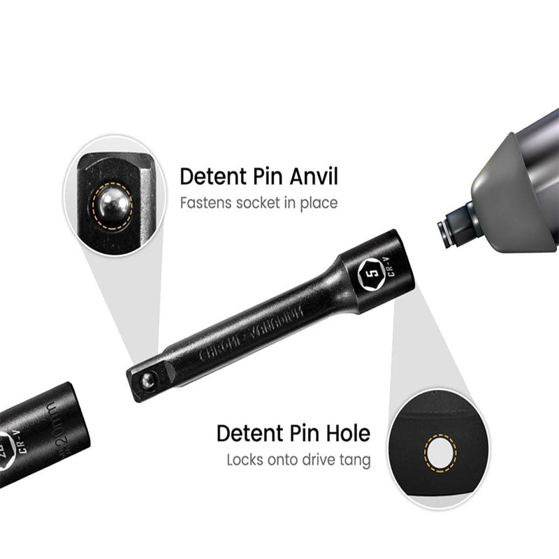【1/2" SOCKET SET】 Set included: 8、9、10、11、12、13、14、15、16、17、18、19、20、21、22mm deep & shallow sockets ; 5", 10"extension bar; 1/2" universal joint. The extension bar can help you turn the bolts and nuts located in the deep recessed part.