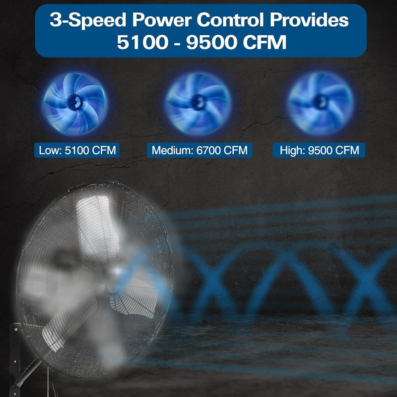 Designed with 3-speed settings: High, Mediun, Low (9500 CFM, 6700 CFM, 5100 CFM).