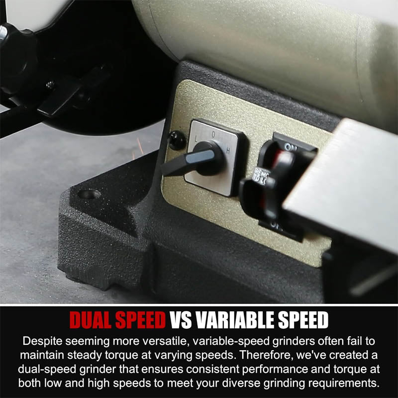 1/2HP dual-speed induction motor with smooth performance and steady torque at both low and high speed. Slow speed is ideal for sharpening edges of woodworking tools, high speed is ideal for quick metal removal
