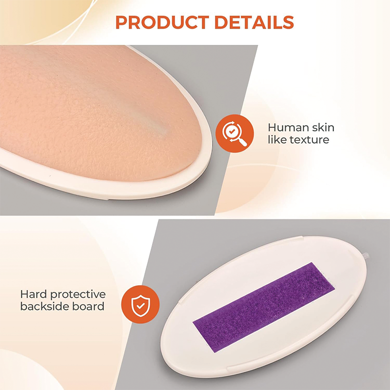 This injection pad is human skin texture. Practicing with this high simulated wearable iv practice trainer makes you feel like working on real people. Hard Protective board on the backside to prevent needles stabbing hand when practice.
