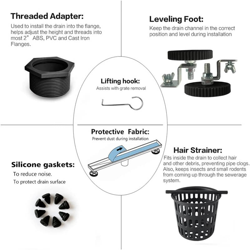 【Linear Shower Drain Accessories】 Open the Grate from both sides of the linear shower drain by using a lifting hook, the strainer can filter hair and particulate impurities effectively. Threaded Adapter joints with rubber ring to adjust the height of the drain.