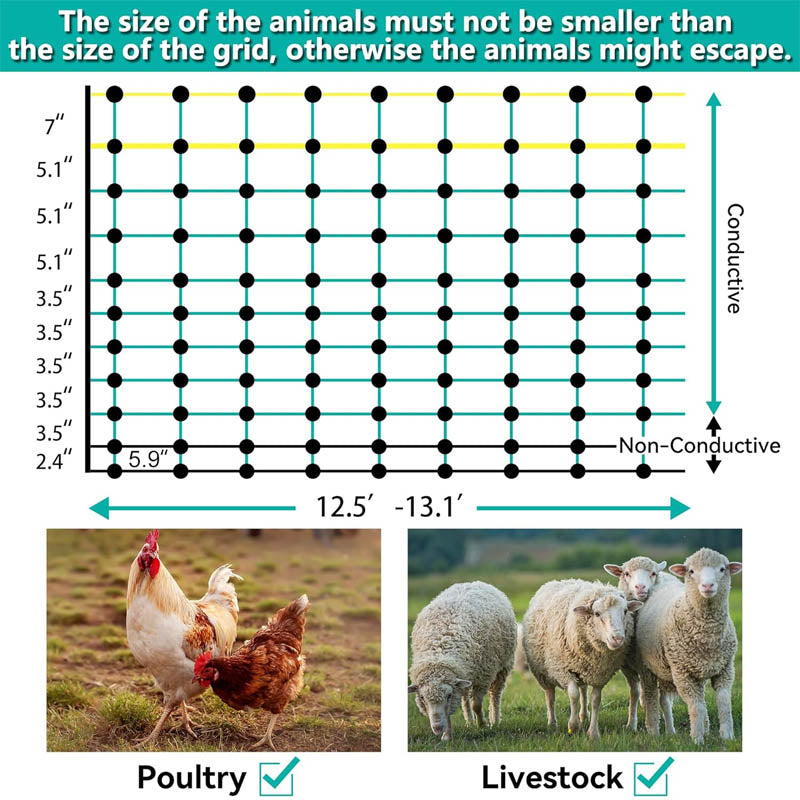【ELECTRICAL CONDUCTIVITY】: Electric poultry netting delivers a low-impedance electric shock that is safe and humane for both animals and humans.Rods with built-in glass fibre rods, not easily broken, placed every 12.5-13.1 ft to provide solid support, triple-braided stainless steel wire.