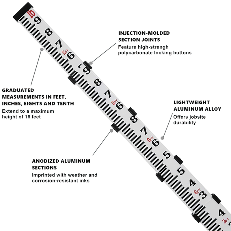 The rod includes 5 telescoping sections, allowing it to extend up to an impressive maximum height of 16 feet. This feature offers versatility and convenience for a wide range of construction measurement tasks.