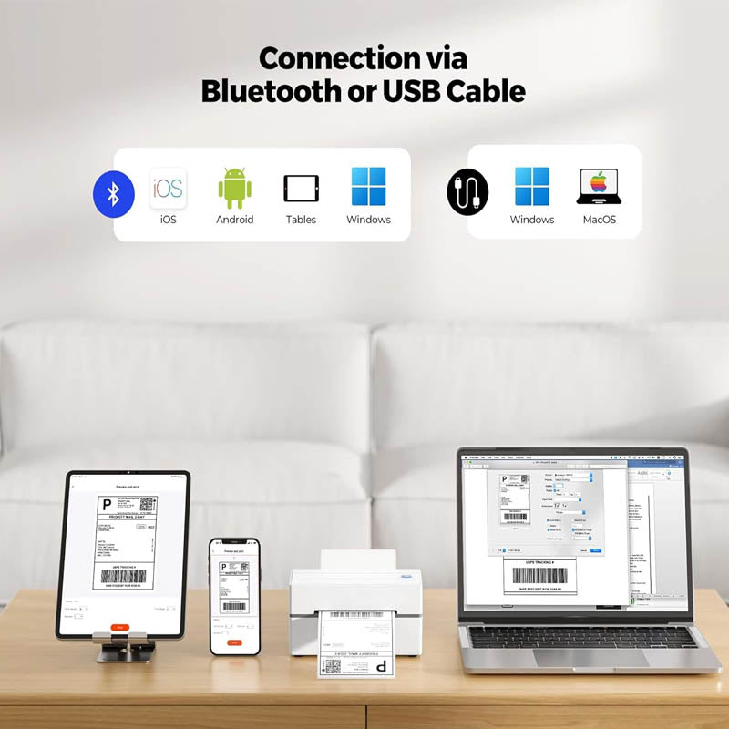 Wide Compatibility: The Bluetooth thermal printer is compatible with eBay, Etsy, Shopify, UPS, and other major shipping and shopping platforms. Suitable for direct thermal labels with widths ranging from 1.57" to 4.3", including envelope labels, package labels, address labels, barcode labels, and labels for home and office