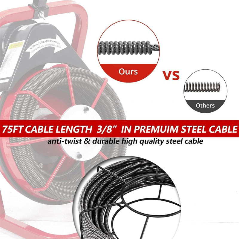 【Powerful and Durable】 Our electric drain auger cleaner is equipped with steel core cable, Unlike air core cables, our solid core cable is made of high quality steel mn65 offers superior toughness, preventing rust, corrosio. It has a high-quality motor and an upgraded steel frame with a special coating to prevent rust and extend its lifespan.