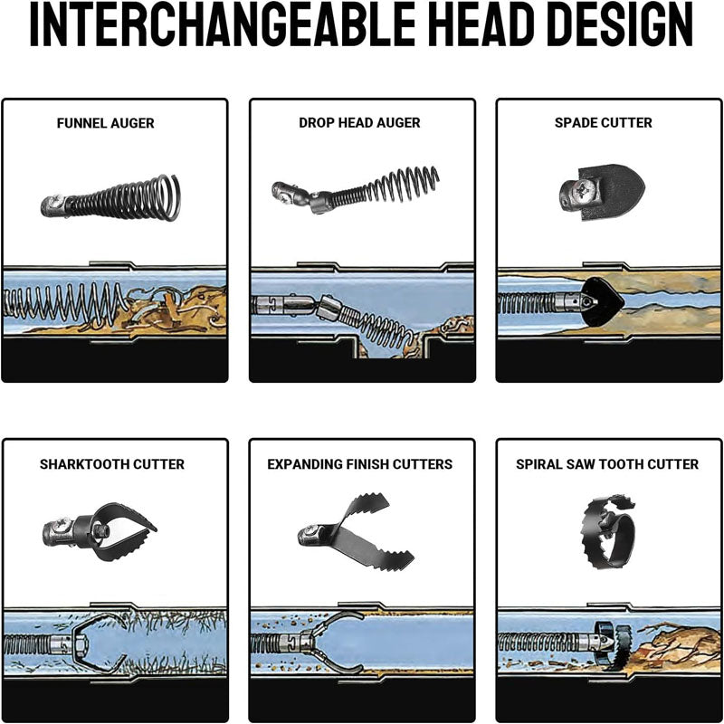 【6 Cutters Quick-Change】We have added a pair of gloves and 6 different alternative cutters : Drop Head Auger, Boring Bulb Cutter, C-Cutter, Side Cutter, Spade cutter, Saw Tooth Cutter, which makes the clog remover versatile.