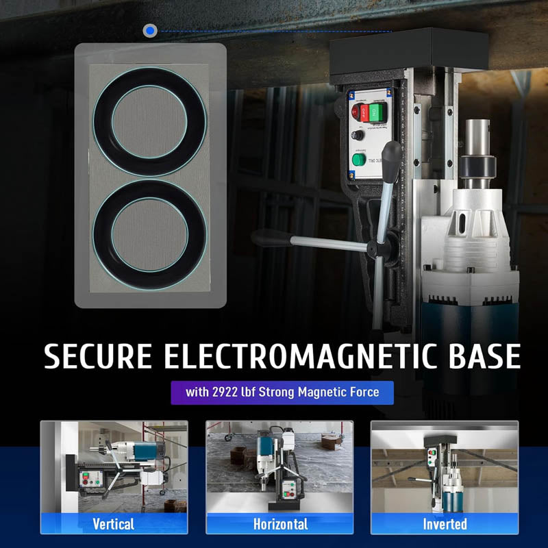 Secure Base: Despite its light weight and portability, our magnetic drill press anchors itself securely during use through its solid iron bottom which acts as a powerful 2920 lbf electromagnet at the flick of a switch.