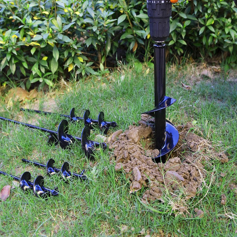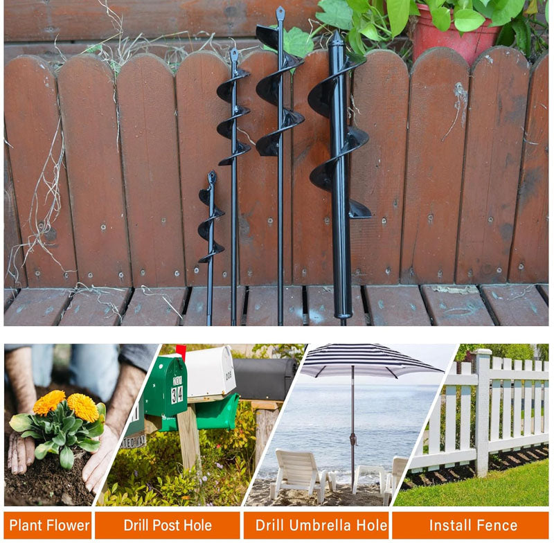 4 PCS GARDEN DRILL BIT AUGER: The garden augers come in 4 sizes 1.6"x8.67", 2"x14.56", 2.6"x16.53", 3.54"x15.7". The auger will also prevent you from back strain, don’t need to bend over so much to dig holes like the traditional way using a shovel.
