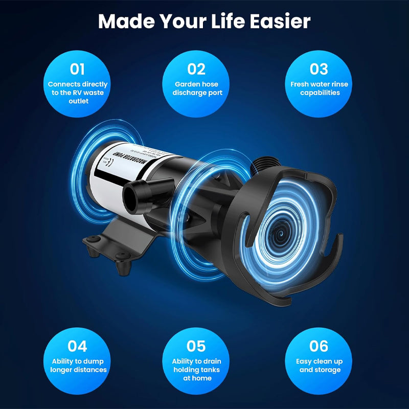 Complete RV Macerator Pump Kit, don't need to buy any accessories, connects to standard 3" RV waste outlet.