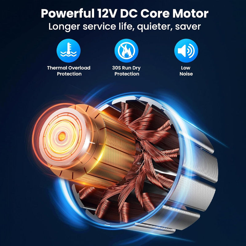 It has the advantages of dry flow protection, thermal protection, intermittent duty cycle, low noise, low power consumption,