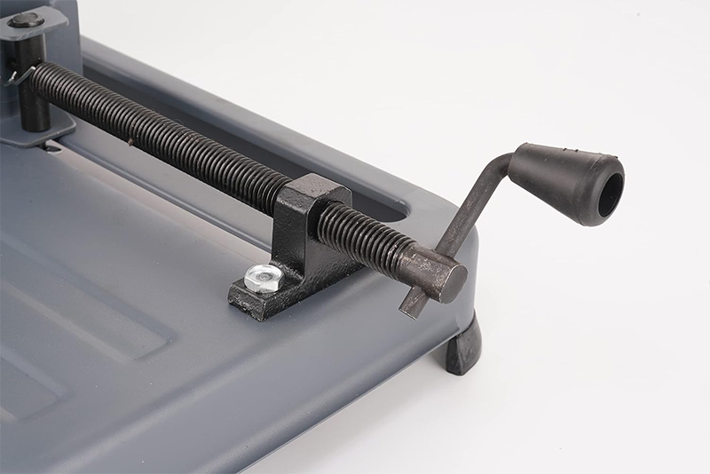 The extra-wide solid steel base provides greater stability when cutting longer materials. Four holes are pre-drilled in the base to