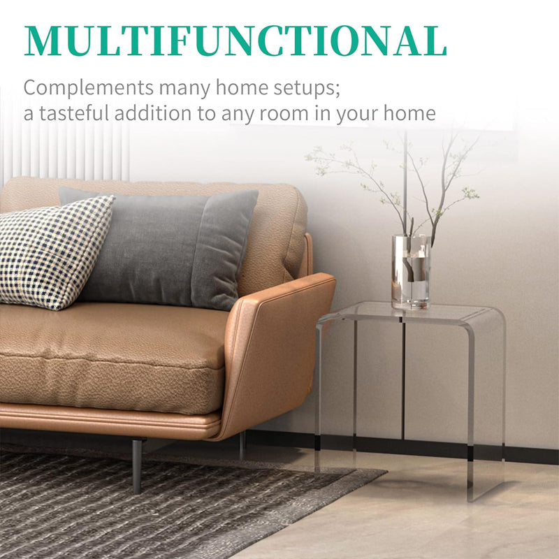 Clean-lined and clear, the U-shaped design clear acrylic side table offers rounded waterfall edges and a glossy finish.