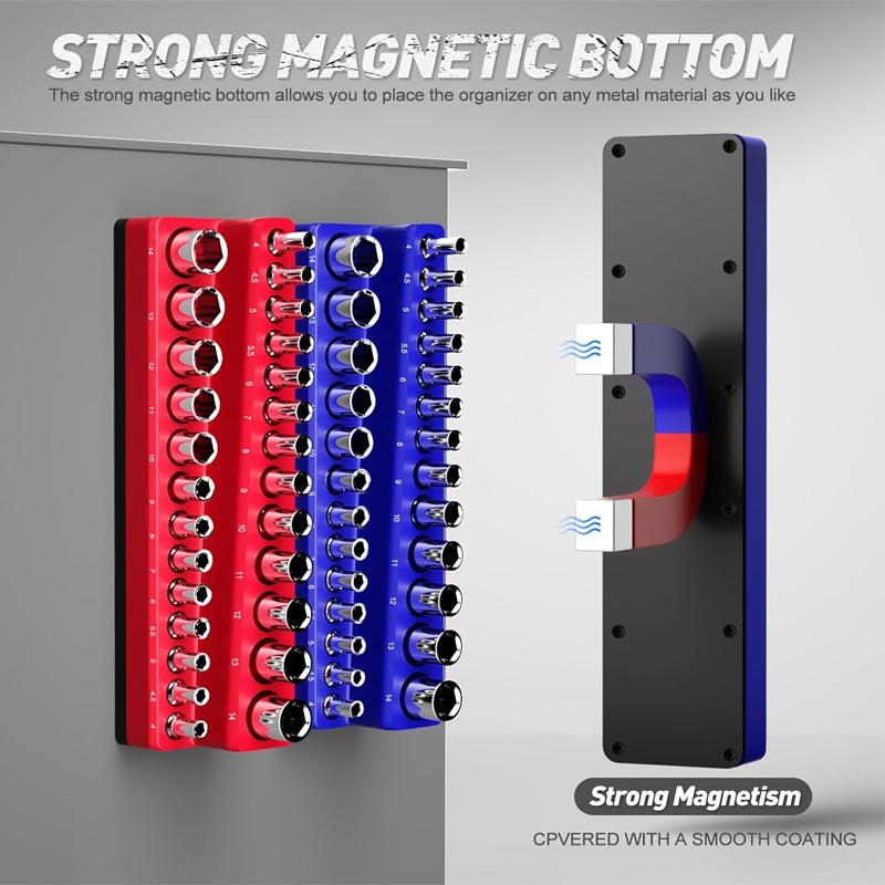 【Large Capacity】Magnetic socket organizer set have 108 socket hold trays for SAE & Metric 3/8,1/4 Inch Drive sockets.The surface of the magnetic holder base have soft rubber which can not scratch your socket and steel toolbox etc.