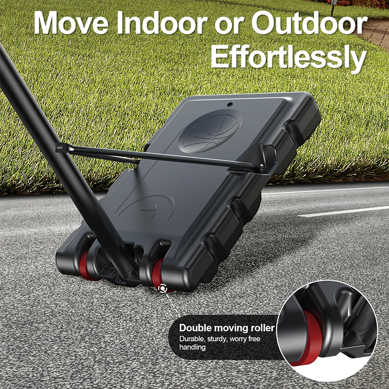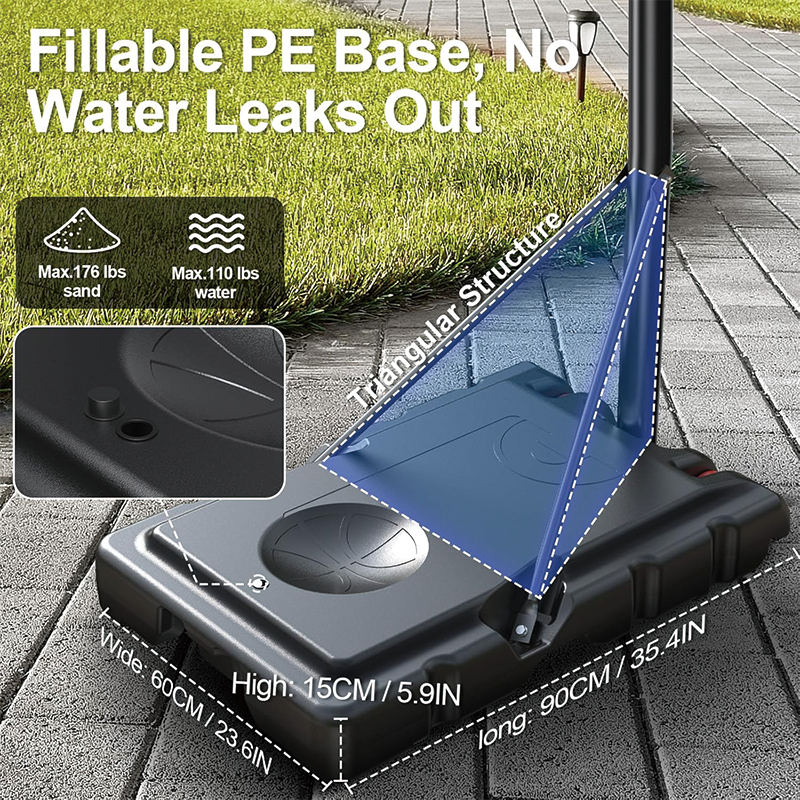 The base built-in 2 wheels, making it easy for you to move the hoop around, you can place it in backyards, basketball court, gyms, swimming pool and other indoor and outdoor places. This Outdoor Basketball Hoop Stand is equipped with a triangular support structure provides exceptional stability during play, the base uses PE material, fill it with 110 lbs water or 170 lbs sand to ensure stability of the base. It is more recommended to use sand to fill the base.