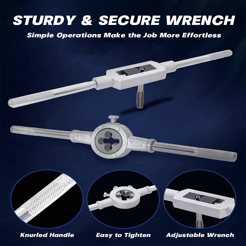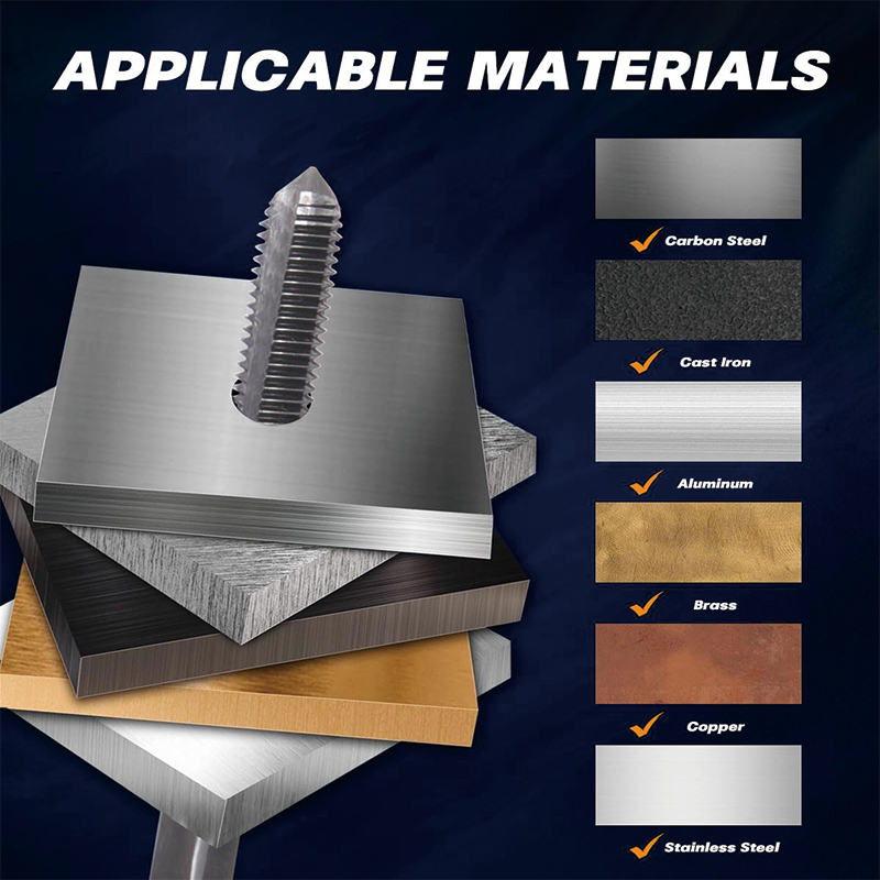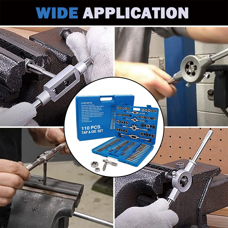 The tap and die set is suitable for the repair of new threads or damaged threads on most metals such as carbon steel, cast iron, aluminum, brass, copper and stainless steel.