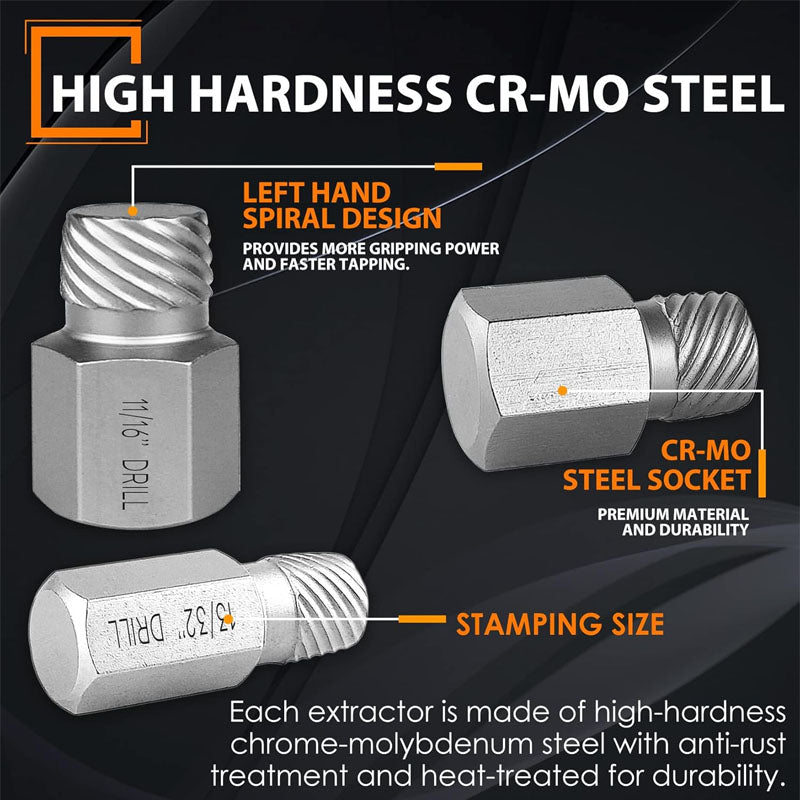 [Material]Each extractors are Made of high hardness chrome-molybdenum steel rust-resistance with heat treatment for superior durability. High visibility laser-etched size for quick identification.