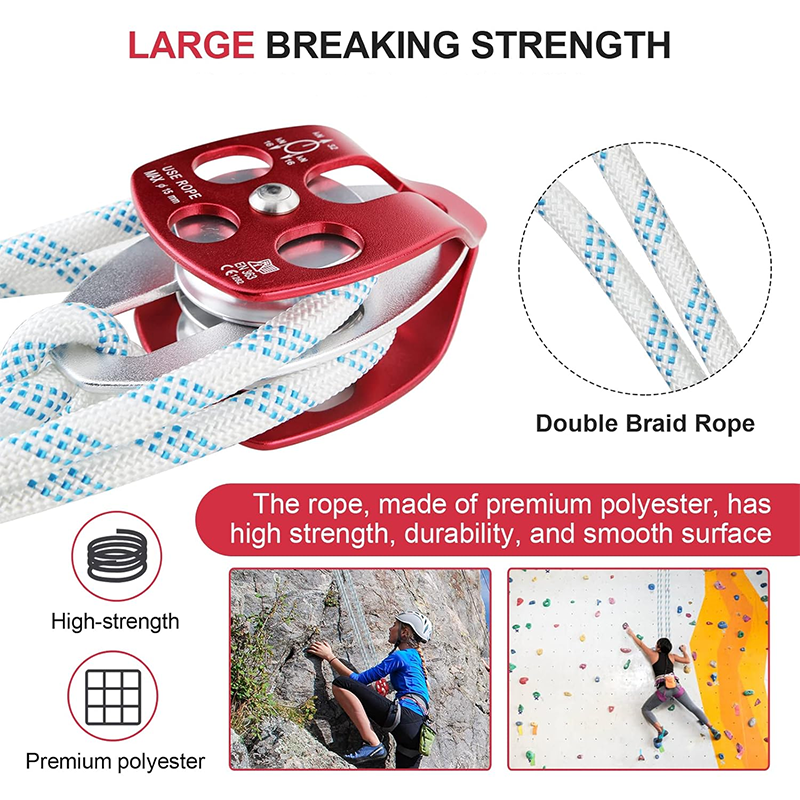 The included braided rope, made of high-quality polyester material, adds strength and flexibility to the double block