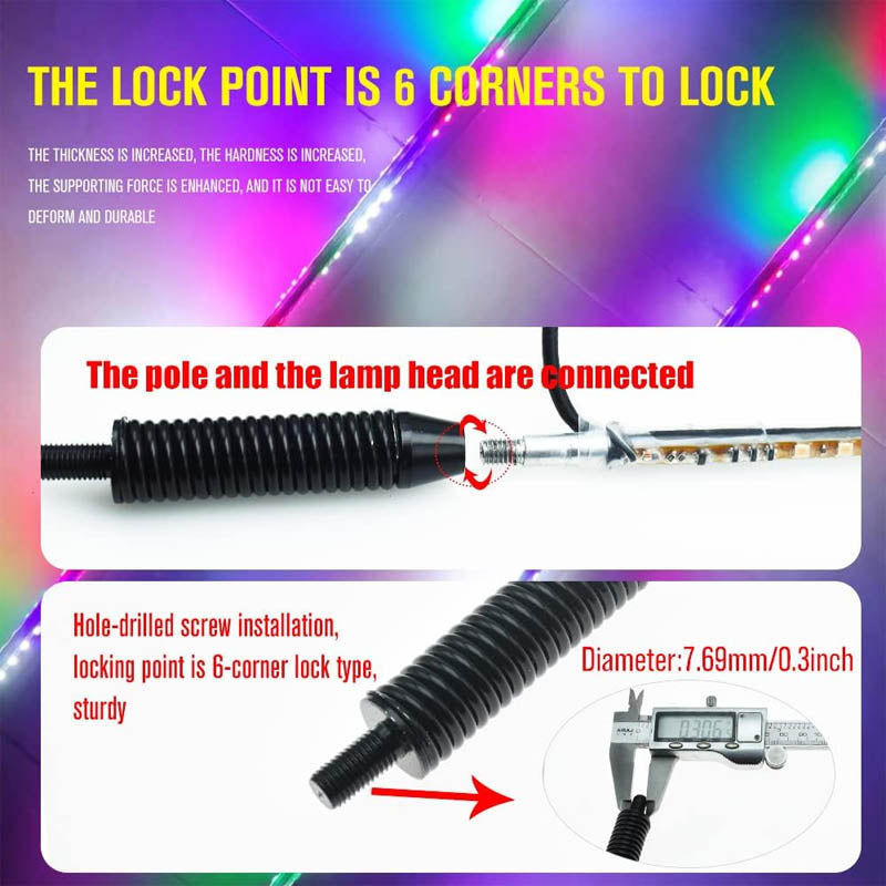 New upgrade: the spring base is used to add more swing flexibility and cushioning pressure,It is suitable for high-speed driving and rough terrain. The inner tube is made of durable plastic rigid tube, which is flexible enough while maintaining a certain stiffness and reduce the possibility of whip lamp fracture.