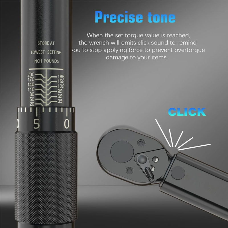【 HIGH QUALITY & DURABILITY】: The 3/8 drive wrench head is made of hardened chromium-vanadium steel. Ratchet multi-sided bite teeth don't slip. When the setting torque value is reached, the wrench will emits click sound to remind you to stop applying force to prevent overtorque damage to your items.