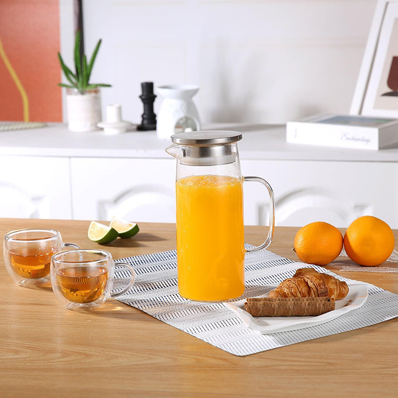 Glass Pitcher Heat Resistant:This water pitcher is made of high-quality borosilicate glass, heat resistant, corrosion, durable and easy cleaning.