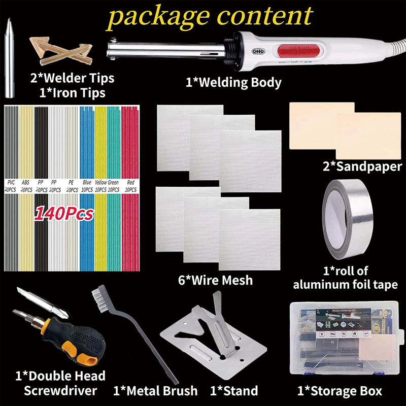 1*Plastic Welder, 1*Double Head Screwdriver, 1*Metal Brush, 3 Types Of Tips, 1*Iron Stand, 6*Reinforcing Stainless Steel Mesh, 5 Types Of Plastic Rods 20 Of Each,40pcs colored welding rods, 2*Sponge Sandpaper,1*roll of aluminum foil tape