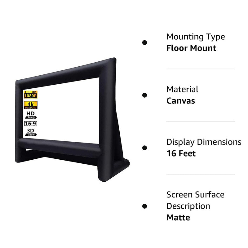 The inflatable movie screen is upgraded to thickened polyester material which support front and rear projection, 160°wide viewing Angle, 16:9 screen ratio, high color reduction.