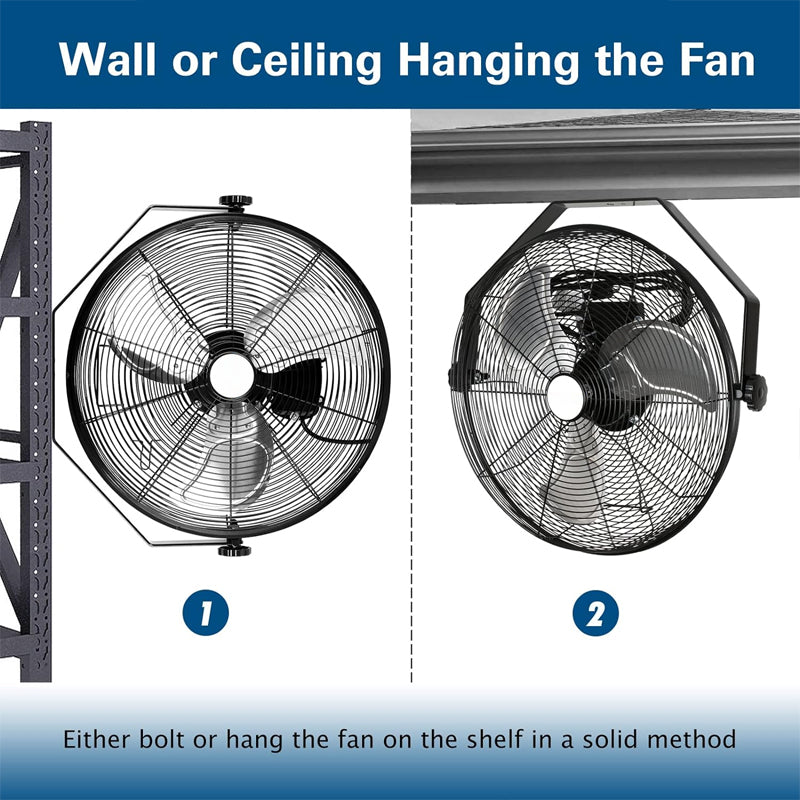Offering versatile installation, the high velocity wall fan can be mounted on the ceiling or mounted on the wall with provided hardware to suit your space.