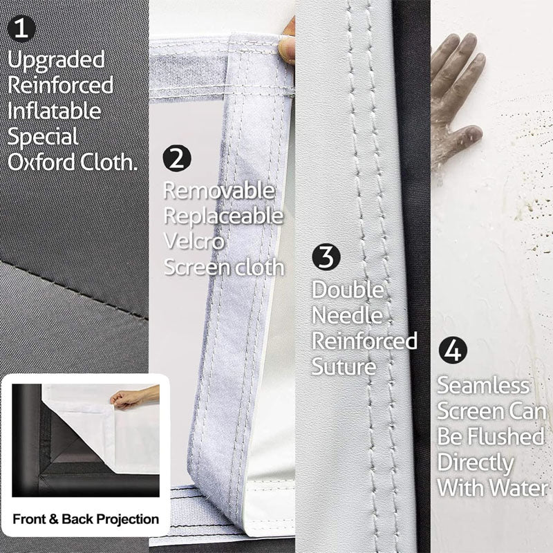 【COMPLETE WITH QUIET ELECTRIC BLOWER】This outdoor projector screen with stand delivers full blowup inflation with low noise in around 2 minutes.This inflatable theater screen is incredibly easy to clean and maintain. The black frame can be wiped clean with any cloth, while the white screen is held on by Velcro and is fully detachable.
