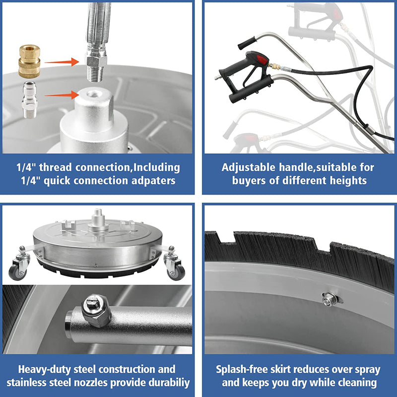 Our surface cleaner has dual high-pressure jets that spin rapidly breaking up dirt and grime.