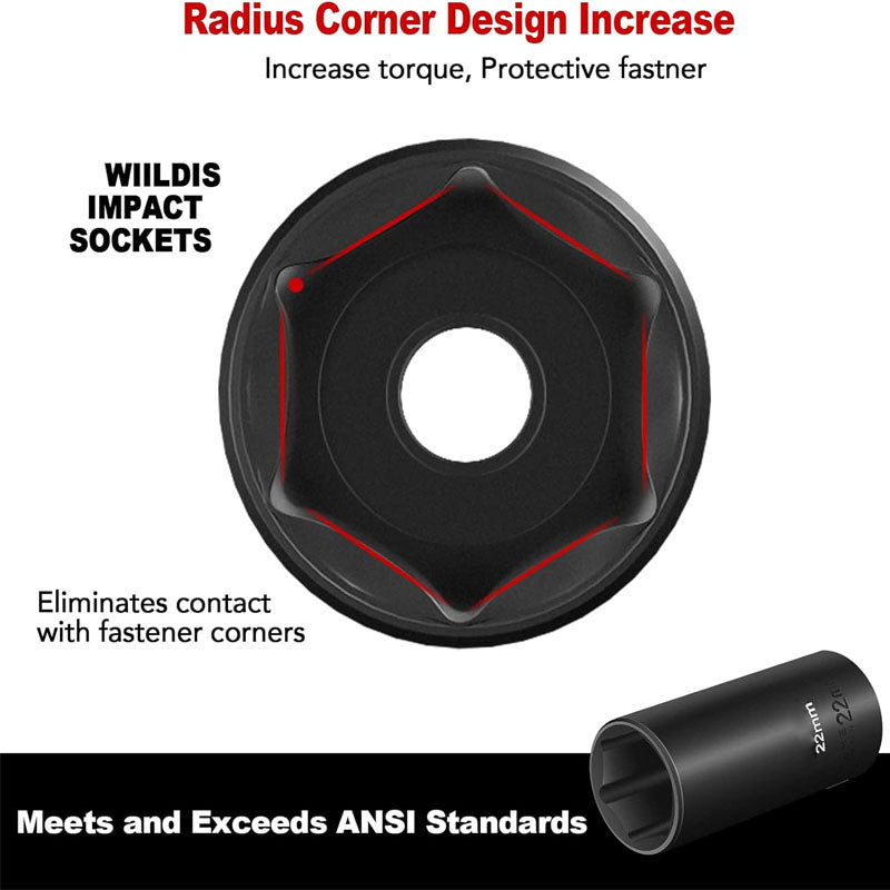 【Radius Corner Design】Deep 6-point sockets with chamfered openings reduces wear during high torque use and increases torque on fasteners. High visibility laser etched markings ensure permanent socket identification.