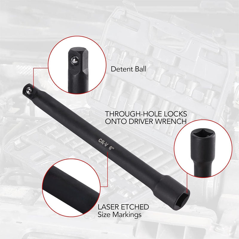 【Accessories】3" and 6" drive impact extension bar, 3/8" impact universal joint, 3/8" to 1/2" adaptor. Contains most of 3/8" socket set needed for repairs.